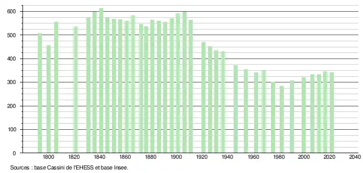 L'évolution du nombre d'habitants est connue à travers les recensements de la population effectués dans la commune depuis 1793. Pour les communes de moins de 10 000 habitants, une enquête de recensement portant sur toute la population est réalisée tous les cinq ans, les populations légales des années intermédiaires étant quant à elles estimées par interpolation ou extrapolation[21]. Pour la commune, le premier recensement exhaustif entrant dans le cadre du nouveau dispositif a été réalisé en 2006[22].