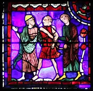 Le catéchumène étant mort sans baptême ne peut pas être enterré chrétiennement, son corps avait donc été laissé à l'extérieur de la ville[6]. Sévère précise que Martin a été absent encore trois jours après la mort du catéchumène, ce qui fait un parallèle avec l'histoire de Lazare. La Légende dorée place cette scène après la deuxième rencontre avec Hilaire de Poitiers, mais la scène des brigands qui lui fait suite dans le vitrail se place au contraire entre ces deux rencontres. |