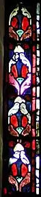 Venant briser cette régularité, les deux coins inférieurs ne sont présents qu'à mi-hauteur, le panneau central en losange s'appuyant directement sur la bordure inférieure. De même, au sommet du vitrail, le dernier étage est contraint par la forme de la voûte en ogive, et est complété par une pointe contenant le dernier quadrilobe.