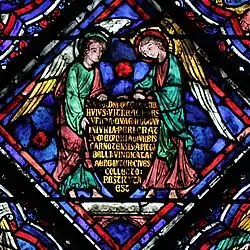 Au centre, deux anges tiennent un écu dont le texte rappelle que le bas de la verrière « que des mains sans respect avaient détruit »[1] a été restauré en 1924 grâce aux dons des habitants.