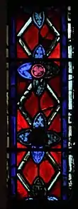 La structure du vitrail est très semblable à celle de vitrail des saintes Marguerite et Catherine, son symétrique dans la chapelle des confesseurs. Les panneaux historiés sont de format sensiblement carré, et portent chacun un quart de cercle, brisé à mi-parcours par un angle carré. L'assemblage de ces panneaux dessine un motif qui se répète par groupe de deux registres, dessinant alternativement un grand cercle sur deux registre, puis sur les deux registres suivants, deux demi-cercles s'appuyant sur les bordures ; le premier registre (où figure le donateur) ne comporte que deux quarts de cercles.
