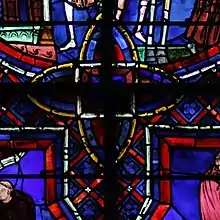 On peut cependant remarquer la grande similitude qu'il y a entre ce panneau et le panneau symétrique du vitrail des saintes Marguerite et Catherine, de l'autre côté de la chapelle : outre que ces deux vitraux présentent les mêmes fonds et les mêmes motifs de bordure dans les panneaux historiés, les deux donateurs sont représentés dans la même attitude de prière devant une vierge à l'enfant, figurant très probablement la statue de Notre-Dame sous terre, statue du XIe siècle brûlée par les vandalismes de 1793[2].
