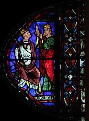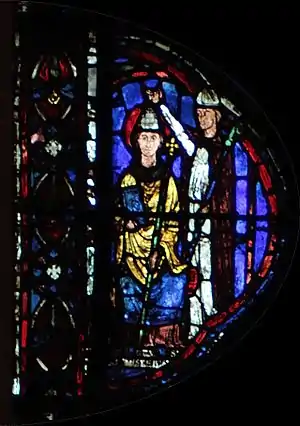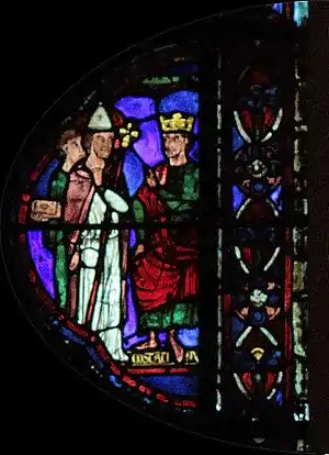 Charlemagne, dont le vitrail fait le pendant de celui-ci dans le déambulatoire nord, marquera ultérieurement une étape ultérieure pour l'occident au VIIIe siècle : c'est par sa dynastie que l'onction a été systématiquement introduite dans le sacre royal, manifestant un basculement dans la légitimité du pouvoir ; par son sacre religieux, le Roi tient son ministère de Dieu (par l’intermédiaire de l’Église), il a pour vocation à ce titre d'être le bras armé de l’Église dans le monde, consacrant la « conception ministérielle de la royauté »[5]. Ces deux vitraux illustrent donc le rapport entre l'autorité spirituelle de l'Église et l'autorité temporelle du souverain au XIIIe siècle, tel qu'il était enseigné par l'Église. Par la suite, la donation de Constantin, apparaissant vers le IXe siècle et dont le caractère inauthentique ne sera établi qu'au XVe siècle, tente de faire remonter cette conception à Constantin lui-même, qui par ce testament inventé sous les carolingiens aurait légué son pouvoir temporel à l'autorité de l'Église.