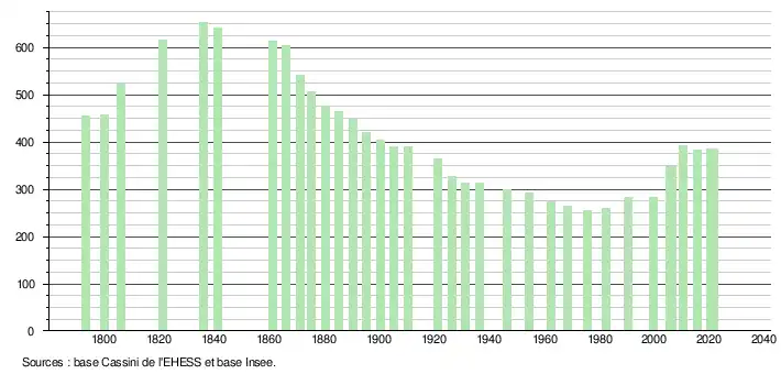 L'évolution du nombre d'habitants est connue à travers les recensements de la population effectués dans la commune depuis 1793. Pour les communes de moins de 10 000 habitants, une enquête de recensement portant sur toute la population est réalisée tous les cinq ans, les populations légales des années intermédiaires étant quant à elles estimées par interpolation ou extrapolation[18]. Pour la commune, le premier recensement exhaustif entrant dans le cadre du nouveau dispositif a été réalisé en 2005[19].