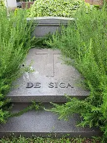 Vittorio De Sica meurt le à l'âge de 73 ans, à la suite d'une intervention chirurgicale pour soigner une tumeur au poumon, à la clinique Hartmann[alpha 1] de Neuilly-sur-Seine[3], dans la proche banlieue parisienne[29] ; la même année, Ettore Scola lui dédie son chef-d'œuvre Nous nous sommes tant aimés. Les funérailles sont célébrées trois jours plus tard dans la basilique Saint-Laurent-hors-les-Murs à Rome ; il repose au cimetière de Verano à Rome. Comme l'a rappelé son fils Christian lors d'une interview à l'émission Le invasioni barbariche, Vittorio De Sica était communiste[30] et ce fait, combiné aux affaires matrimoniales mentionnées ci-dessus, a contribué à ce que ses funérailles gardent une certaine sobriété[31],[32]. Trente-cinq ans plus tard, Annarosa Morri et Mario Canale lui ont consacré le documentaire Vittorio D., présenté à la Mostra de Venise 2009 et diffusé par la suite sur LA7.