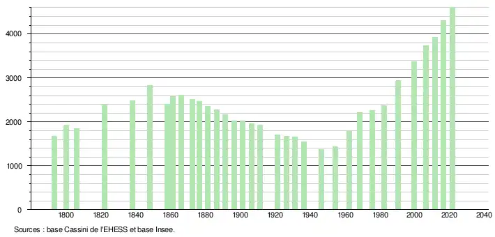 L'évolution du nombre d'habitants est connue à travers les recensements de la population effectués dans la commune depuis 1793. Pour les communes de moins de 10 000 habitants, une enquête de recensement portant sur toute la population est réalisée tous les cinq ans, les populations légales des années intermédiaires étant quant à elles estimées par interpolation ou extrapolation[28]. Pour la commune, le premier recensement exhaustif entrant dans le cadre du nouveau dispositif a été réalisé en 2006[29].