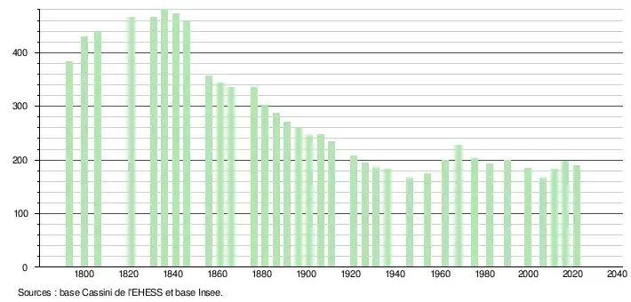 L'évolution du nombre d'habitants est connue à travers les recensements de la population effectués dans la commune depuis 1793. Pour les communes de moins de 10 000 habitants, une enquête de recensement portant sur toute la population est réalisée tous les cinq ans, les populations légales des années intermédiaires étant quant à elles estimées par interpolation ou extrapolation[21]. Pour la commune, le premier recensement exhaustif entrant dans le cadre du nouveau dispositif a été réalisé en 2006[22].