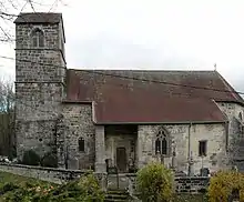 - L'église[29] comporte une partie romane du XIIe siècle (le clocher) et le reste de style gothique flamboyant de la fin du XVe siècle et du début du XVIe siècle. Le trésor sacré a été saisi au dépouillement de l'an II et comportait principalement des vases d'argent. Elle a été édifiée en l'honneur de saint Élophe, patron de la paroisse. À l’extérieur de l'église, au-dessus de la porte latérale, un cadran solaire a été tracé à une hauteur d'environ trois mètres.On peut remarquer l'inscription de la date : 1687, et des lettres : P.A.R.I.M.