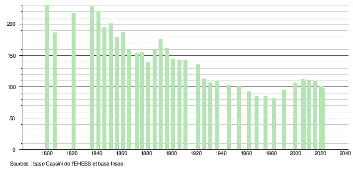 L'évolution du nombre d'habitants est connue à travers les recensements de la population effectués dans la commune depuis 1800. Pour les communes de moins de 10 000 habitants, une enquête de recensement portant sur toute la population est réalisée tous les cinq ans, les populations légales des années intermédiaires étant quant à elles estimées par interpolation ou extrapolation[27]. Pour la commune, le premier recensement exhaustif entrant dans le cadre du nouveau dispositif a été réalisé en 2005[28].