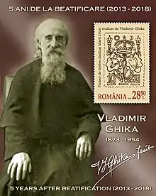 Vladimir Ghika, Vladimir Ghyka ou Ghica, né à Constantinople le et mort à la prison de Jilava (près de Bucarest) le , est un prélat roumain issu d'une famille princière. Initialement orthodoxe, il passe au catholicisme et est ordonné prêtre catholique[1]. Diplomate du Saint-Siège, fondateur d'hospices, adversaire du nazisme et du communisme, il est arrêté à près de 80 ans et meurt sous la torture en prison.