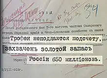 D'énormes entrepôts d'armes, de munitions, de médicaments, ainsi que la moitié des réserves d'or de la Russie impériale (650 millions de roubles en pièces d'or, des lingots d'or et de platine, des bijoux et objets de valeur pris aux capitalistes et aux nobles et d'autres objets de valeur) sont saisis. Vladimir fait transférer toutes ces richesses loin de Kazan vers des zones sûres.