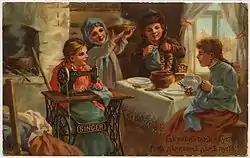 La mode est au style loubok, style russe illustrant souvent des scènes campagnardes bien souvent avec ironie; c'est ce public populaire qui accède alors à une condition matérielle meilleure (dans les années 1900-1910) que vise la compagnie Singer pour ses machines à coudre, mais aussi les citadins « attendris » par la gaieté, l'authenticité et la simplicité d'une vie paysanne dépeinte comme plaisante et pleine d'esprit. Ainsi la carte postale intitulée «Где работа там и густо, а в ленивом доме пусто» (là où l'on travaille bien, la maison du paresseux est vide) représente une maison de village avec une famille nombreuse et laborieuse près d'une machine à coudre Singer. Elle convient non seulement au caractère paysan, mais aussi aux vertus bourgeoises: l'amour du travail bien fait, le zèle et l'esprit de famille qui mènent au bien-être naturel et qui est symbolisé ici par la machine Singer.