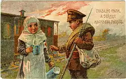 Parfois le style loubok frôle la caricature. Sa série sur les forces politiques en 1917 intervient dans un pays déchiré par les contradictions douloureuses au fur et à mesure de la conduite de la guerre, puis de la révolution. Les dix cartes postales figurent des personnages enfantins dépeints avec un petit nez retroussé, une expression espiègle et de grands yeux ronds; l'un d'eux se promène avec ses lunettes, un journal déployé (le modéré), ou un autre est en chemise paysanne avec des souliers d'écorce de bouleau (le travailliste), et un autre personnage serre sa serviette de cuir sur le ventre (le KD) ou bien un autre pointe un revolver (le socialiste révolutionnaire): en un mot tous - sous des traits enfantins - sont le jouet de la grande politique. Ces dessins de l'année 1917 sont presque des charges, comme ce garçon bolchévique à l'expression hautaine et méprisante devant un tout petit garçon menchévik; ces dessins expriment peut-être l'indifférence de l'artiste vis-à-vis des jeux politiques dangereux de ses contemporains.