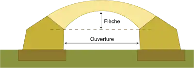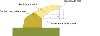 Une voûte se définit par son ouverture et son surbaissement[M 2]. Si l'ouverture de la voûte est désignée par "2a" et la flèche par "f", le surbaissement de la voûte, désigné par la lettre , est le rapport flèche/ouverture soit :