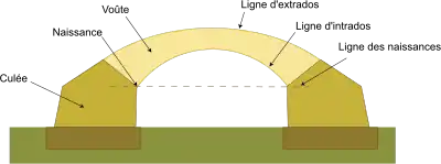 Les points d'intersection de la ligne d'intrados avec ces verticales s'appellent les naissances ou les reins. La distance qui sépare les culées s'appelle l'ouverture.