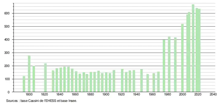 L'évolution du nombre d'habitants est connue à travers les recensements de la population effectués dans la commune depuis 1793. Pour les communes de moins de 10 000 habitants, une enquête de recensement portant sur toute la population est réalisée tous les cinq ans, les populations légales des années intermédiaires étant quant à elles estimées par interpolation ou extrapolation[15]. Pour la commune, le premier recensement exhaustif entrant dans le cadre du nouveau dispositif a été réalisé en 2008[16].