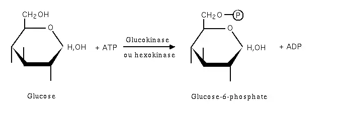 Cette étape est commune à la glycolyse et à la voie des pentoses phosphates. Catalysée par une kinase (hexokinase ou glucokinase) :