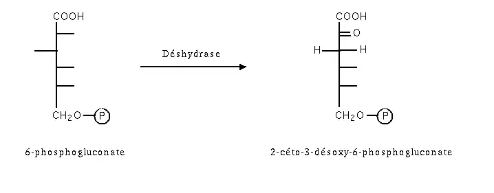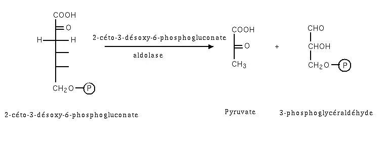 Catalysée par la 2-déshydro-3-désoxy-phosphogluconate aldolase (ou 2-céto-3-désoxy-6-phosphogluconate aldolase) :