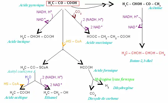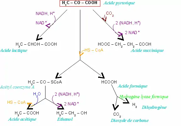 Après la glycolyse, le devenir d'une molécule de pyruvate (acide oxypropanoïque) en anaérobiose conduit à des catabolites différents.