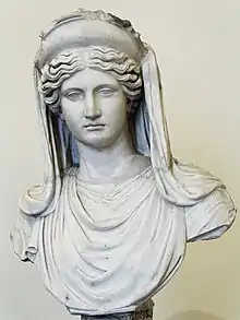 Les historiens antiquisants ont longtemps nié le port du voile dans la civilisation grecque, « berceau de la démocratie », évoquant le port de châle et de tissu, jusqu'aux travaux du professeur d'archéologie Caroline Galt[4]. Dans la société grecque antique, l’épouse est tenue de se couvrir la tête. La sculpture antique nous a laissé une trace de cette symbolique : les déesses représentant le mariage, le foyer ou la famille sont le plus souvent voilées alors que les déesses célibataires comme Artémis ou Aphrodite, ne le sont pour ainsi dire jamais.