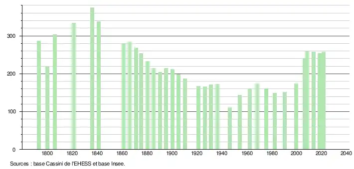 L'évolution du nombre d'habitants est connue à travers les recensements de la population effectués dans la commune depuis 1793. Pour les communes de moins de 10 000 habitants, une enquête de recensement portant sur toute la population est réalisée tous les cinq ans, les populations légales des années intermédiaires étant quant à elles estimées par interpolation ou extrapolation[17]. Pour la commune, le premier recensement exhaustif entrant dans le cadre du nouveau dispositif a été réalisé en 2008[18].