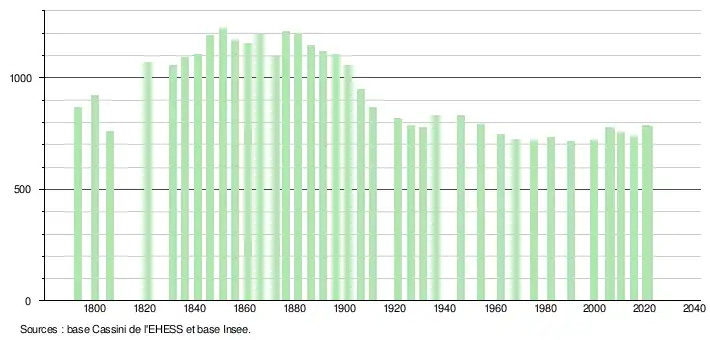 L'évolution du nombre d'habitants est connue à travers les recensements de la population effectués dans la commune depuis 1793. Pour les communes de moins de 10 000 habitants, une enquête de recensement portant sur toute la population est réalisée tous les cinq ans, les populations légales des années intermédiaires étant quant à elles estimées par interpolation ou extrapolation[16]. Pour la commune, le premier recensement exhaustif entrant dans le cadre du nouveau dispositif a été réalisé en 2005[17].