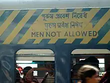 À Bombay, tous les trains de banlieue sont dotés de compartiments réservés aux femmes, même si les enfants en âge d'aller à l'école peuvent aussi y monter. Deux compartiments sont réservés aux femmes pendant 24 heures et un autre leur est réservé à des horaires spécifiques. Les compartiments pour femmes sont des voitures de première et deuxième classe. Aux heures de pointe, il existe aussi trois ou quatre rames entièrement réservées aux femmes. Comme le nombre de voyageuses a doublé dans les années 2000, la demande est forte pour de type de service[10]. De nombreux trains présentent des compartiments pour femmes comme, entre autres, le métro de Bombay et le métro de Delhi[11]. Ce mouvement a aussi conduit à l'établissement de taxis pour femmes : les tuk-tuk roses (en)[12].