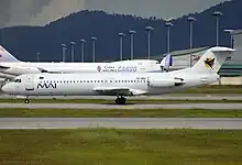 XY-AGC, le Fokker F100 impliqué dans l'accident, ici photographié à l'aéroport international de Yangon en septembre 2005. | |||