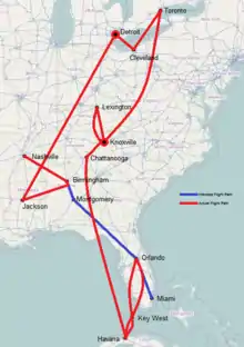 Alors qu'ils se trouvent au-dessus d'Oak Ridge, les pirates de l'air négocient avec de nombreux responsables, y compris des membres du Federal Bureau of Investigation (FBI), qui ne réussissent qu'à obtenir deux millions de dollars de rançon. L'avion atterrit ensuite à Chattanooga, dans le Tennessee, après avoir décollé de Knoxville. Après avoir récupéré l'argent, qui ne constitue qu'une partie de la rançon demandée initialement, l'avion décolle à nouveau, en direction de La Havane, à Cuba. Les pirates de l'air distribuent alors une partie de l'argent de la rançon aux passagers[7]. Par la suite, malgré leur atterrissage sur le sol cubain et contrairement aux attentes des pirates, le dirigeant cubain Fidel Castro ne les accepte pas dans le pays. Les trois hommes dirigent alors l'avion vers Orlando, en Floride, puis envisagent même de voler vers l'Algérie (ce qui n'était pas possible en raison de la portée limitée de l'avion)[8]. Cette situation marque ainsi la première fois qu'un avion détourné quitte Cuba avec les pirates de l'air toujours présents à bord. Alors que l'avion est arrêté pour faire le plein à l'aéroport McCoy d'Orlando, le FBI tire sur deux des quatre pneus principaux de l'avion[9], précipitant les pirates de l'air à tirer sur le copilote Harold Johnson au bras et à forcer le commandant de bord William Haas à décoller[10],[11],[12].
