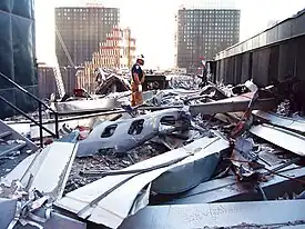 Quelques minutes après la dernière communication avec l'équipe de pompiers qui, ayant atteint le 78e étage, portait secours aux blessés et s'apprêtait à éteindre deux foyers résiduels, le chef pompier Ganci reçoit le messager du bureau des urgences (OEM), Steve Moscillo déclarant que « les immeubles allaient s'effondrer et qu'il fallait les évacuer » (interrogé par ABC News, le maire Giuliani, membre de l'OEM, reconnaissait qu'il n'avait fait que transmettre cette information et l'origine de cette prévision reste inconnue). Quelques minutes plus tard, la section au-dessus de l'impact s'incline vers le Sud, une rotation qui traduisait la perte totale du soutien de la structure interne, malgré la résistance de la partie intacte de la structure externe (le « tube »). Puis, après une accélération jusqu'à un angle d'environ 25°, cette rotation cesse brusquement, laissant la place au développement d'un énorme nuage « éruptif » qui progressa à l'identique au long de la tour jusqu'à son pied, des éléments lourds (plusieurs dizaines de tonnes) étant projetés à cent vingt mètres de distance, les plus légers à plus de quatre cents mètres, le contenu des étages (ciment des sols, plâtre des cloisons, meubles, équipement, êtres humains) étant réduits en poussière ou fragments. La plupart des vestiges se sont ainsi trouvés répartis autour du pied de la tour et sur les immeubles environnants.