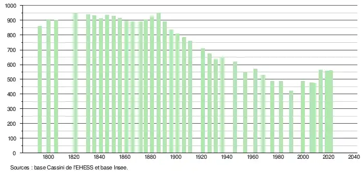 L'évolution du nombre d'habitants est connue à travers les recensements de la population effectués dans la commune depuis 1793. Pour les communes de moins de 10 000 habitants, une enquête de recensement portant sur toute la population est réalisée tous les cinq ans, les populations légales des années intermédiaires étant quant à elles estimées par interpolation ou extrapolation[35]. Pour la commune, le premier recensement exhaustif entrant dans le cadre du nouveau dispositif a été réalisé en 2008[36].