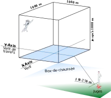 Lors d'une compétition, les évolutions doivent être réalisées dans un volume cubique de 1 000 m de côté. Ce volume est matérialisé au sol par des repères blancs de neuf mètres sur deux. Les pilotes ne doivent pas évoluer, pour des raisons de sécurité, en dessous de la hauteur de 100 mètres. Le pilote doit réaliser son programme dans ce volume sans en dépasser les limites sous peine de pénalisation par le jury[10]. Celui-ci, un peu à l'image d'une compétition de patinage artistique, note la symétrie et la précision d’exécution des figures.