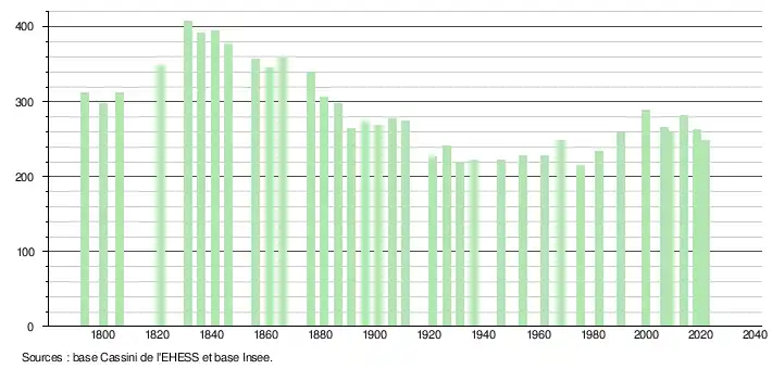 L'évolution du nombre d'habitants est connue à travers les recensements de la population effectués dans la commune depuis 1793. Pour les communes de moins de 10 000 habitants, une enquête de recensement portant sur toute la population est réalisée tous les cinq ans, les populations légales des années intermédiaires étant quant à elles estimées par interpolation ou extrapolation[17]. Pour la commune, le premier recensement exhaustif entrant dans le cadre du nouveau dispositif a été réalisé en 2008[18].