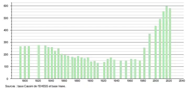 L'évolution du nombre d'habitants est connue à travers les recensements de la population effectués dans la commune depuis 1793. Pour les communes de moins de 10 000 habitants, une enquête de recensement portant sur toute la population est réalisée tous les cinq ans, les populations légales des années intermédiaires étant quant à elles estimées par interpolation ou extrapolation[20]. Pour la commune, le premier recensement exhaustif entrant dans le cadre du nouveau dispositif a été réalisé en 2006[21].