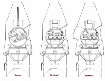 Le module Voskhod est un module Vostok modifié. D'une part une rétrofusée à combustible solide a été ajoutée au sommet du module de retour ; d'autre part, afin de pouvoir y installer trois personnes, aucun siège éjectable n'y a été installé et les occupants ne disposent pas de scaphandres. Les trois sièges-baquets ont été installés à 90° de la position initiale à l'intérieur du Vostok. A cette occasion, Komarov a dû « réapprendre » à piloter avec toutes les indications de son tableau de bord orientées à la verticale. L'atmosphère intérieure est un mélange d'oxygène et d'hélium, en légère surpression à 1,1 atmosphère.