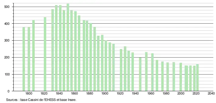 L'évolution du nombre d'habitants est connue à travers les recensements de la population effectués dans la commune depuis 1793. Pour les communes de moins de 10 000 habitants, une enquête de recensement portant sur toute la population est réalisée tous les cinq ans, les populations légales des années intermédiaires étant quant à elles estimées par interpolation ou extrapolation[18]. Pour la commune, le premier recensement exhaustif entrant dans le cadre du nouveau dispositif a été réalisé en 2007[19].