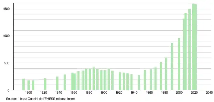 L'évolution du nombre d'habitants est connue à travers les recensements de la population effectués dans la commune depuis 1793. Pour les communes de moins de 10 000 habitants, une enquête de recensement portant sur toute la population est réalisée tous les cinq ans, les populations légales des années intermédiaires étant quant à elles estimées par interpolation ou extrapolation[16]. Pour la commune, le premier recensement exhaustif entrant dans le cadre du nouveau dispositif a été réalisé en 2008[17].