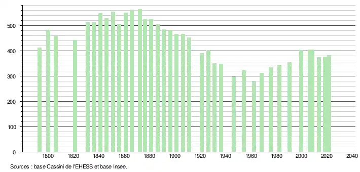 L'évolution du nombre d'habitants est connue à travers les recensements de la population effectués dans la commune depuis 1793. Pour les communes de moins de 10 000 habitants, une enquête de recensement portant sur toute la population est réalisée tous les cinq ans, les populations légales des années intermédiaires étant quant à elles estimées par interpolation ou extrapolation[28]. Pour la commune, le premier recensement exhaustif entrant dans le cadre du nouveau dispositif a été réalisé en 2008[29].