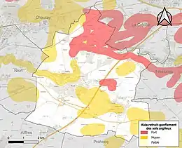 Les mouvements de terrains susceptibles de se produire sur la commune sont des tassements différentiels[17]. Le retrait-gonflement des sols argileux est susceptible d'engendrer des dommages importants aux bâtiments en cas d’alternance de périodes de sécheresse et de pluie[18]. 41,2 % de la superficie communale est en aléa moyen ou fort (54,9 % au niveau départemental et 48,5 % au niveau national)[Carte 2]. Depuis le , en application de la loi ELAN, différentes contraintes s'imposent aux vendeurs, maîtres d'ouvrages ou constructeurs de biens situés dans une zone classée en aléa moyen ou fort[Note 3],[19].