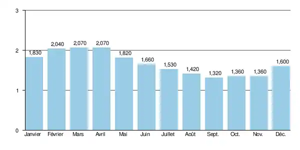 Les crues sont rarement importantes, même compte tenu de la petitesse du bassin versant. Les QIX 2 et QIX 5 valent respectivement 6,9 et 9,9 m3/s. Le QIX 10 est de 12 m3/s, le QIX 20 de 14 m3/s, tandis que le QIX 50 se monte à 16 m3/s.