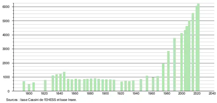L'évolution du nombre d'habitants est connue à travers les recensements de la population effectués dans la commune depuis 1793. Pour les communes de moins de 10 000 habitants, une enquête de recensement portant sur toute la population est réalisée tous les cinq ans, les populations légales des années intermédiaires étant quant à elles estimées par interpolation ou extrapolation[40]. Pour la commune, le premier recensement exhaustif entrant dans le cadre du nouveau dispositif a été réalisé en 2004[41].