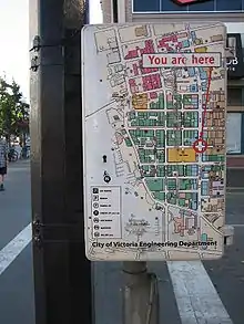 « Vous êtes ici » est une mention traditionnellement portée sur les cartes implantées à un endroit fixe, afin d'indiquer la position de la carte sur l'espace qu'elle décrit. Toute personne lisant la carte étant nécessairement au même endroit que celle-ci, cette indication permet aux lecteurs de savoir rapidement leur position sur la carte, et donc de déterminer plus facilement leur itinéraire pour atteindre leur but.