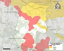 Le retrait-gonflement des sols argileux est susceptible d'engendrer des dommages importants aux bâtiments en cas d’alternance de périodes de sécheresse et de pluie. 57,9 % de la superficie communale est en aléa moyen ou fort (67,4 % au niveau départemental et 48,5 % au niveau national). Sur les 208 bâtiments dénombrés sur la commune en 2019, 197 sont en aléa moyen ou fort, soit 95 %, à comparer aux 81 % au niveau départemental et 54 % au niveau national. Une cartographie de l'exposition du territoire national au retrait gonflement des sols argileux est disponible sur le site du BRGM[23],[Carte 3].