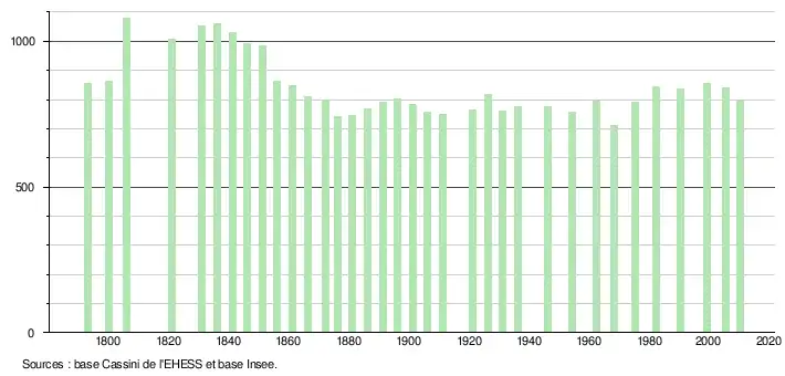 - Dans le tableau des recensements et le graphique, par convention dans Wikipédia, le principe a été retenu, pour les populations légales postérieures à 1999 de n’afficher dans le tableau des recensements et le graphique que les populations correspondant à l'année 2006, première population légale publiée calculée conformément aux concepts définis dans le décret no 2003-485 du 5 juin 2003, et les années correspondant à une enquête exhaustive de recensement pour les communes de moins de 10 000 habitants, ainsi que la dernière population légale publiée par l’Insee.