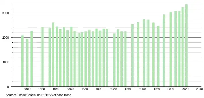 L'évolution du nombre d'habitants est connue à travers les recensements de la population effectués dans la commune depuis 1793. Pour les communes de moins de 10 000 habitants, une enquête de recensement portant sur toute la population est réalisée tous les cinq ans, les populations légales des années intermédiaires étant quant à elles estimées par interpolation ou extrapolation[36]. Pour la commune, le premier recensement exhaustif entrant dans le cadre du nouveau dispositif a été réalisé en 2006[37].