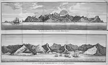 En fait, il faisait anormalement beau : un williwaw[9], accourut du Sud et faillit jeter l'escadre sur l'île des États. Les Britanniques virent de près les rivages de l'île aux rochers hideusement déchiquetés, mais ils s'en tirèrent, et reprirent leur progression en tirant des bords vers l'ouest, vent debout. Le beau temps revint, et avec lui le moral des équipages s'améliora, on fit route, toujours vent debout, pour doubler le Horn.