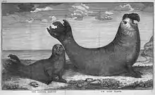 D'autres équipes arpentaient les rivages de l'île. Ils tuèrent des otaries, qui étaient de plus petite taille que celles qu'ils connaissaient, mais avaient de plus longues moustaches, et furent stupéfaits de voir d'énormes phoques, si gras qu'ils tremblaient comme de la gelée quand ils se déplaçaient. Les plus gros mâles, énormes (jusqu'à vingt pieds de long), régnaient sur un harem de femelles plus petites, et se dressaient en rugissant, ou se cambraient en arc pour se dodeliner, en levant bien haut leur mufle surmonté d'une trompe…[11]. Ils les appelèrent « lions de mer » (ce sont en fait des « éléphants de mer [réf. nécessaire] »), puis, comme leur chair était délicieuse (surtout le cœur et la langue), les renommèrent beef pour les adultes et veal (veau) pour les jeunes. Leur graisse surabondante, une fois fondue et mélangée de cendres serait stockée dans des tonneaux pour servir d'espalme (suif à calfater).