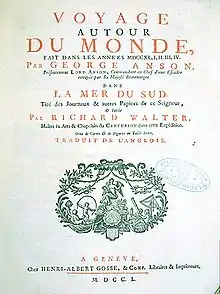 - Voyage autour du monde, fait dans les années MDCCXL, I, II, III, IV / par George Anson... commandant en chef d'una escadre envoyée par sa majesté britannique dans la Mer du Sud..., & publié par Richard Walter, maitre des arts & chapelain du Centurión dans cette expedition. - Orné de cartes & de figures en taille douce ; Traduit de anglois. - À Amsterdam et à Leipzig : Chez Arkstee & Merkus, 1749.