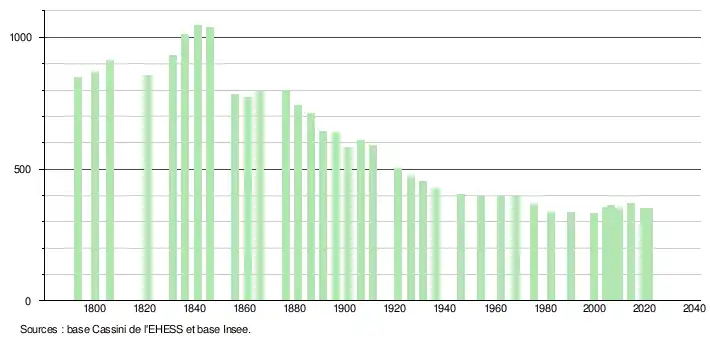 L'évolution du nombre d'habitants est connue à travers les recensements de la population effectués dans la commune depuis 1793. Pour les communes de moins de 10 000 habitants, une enquête de recensement portant sur toute la population est réalisée tous les cinq ans, les populations légales des années intermédiaires étant quant à elles estimées par interpolation ou extrapolation[17]. Pour la commune, le premier recensement exhaustif entrant dans le cadre du nouveau dispositif a été réalisé en 2004[18].