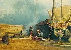La scène de genre des bateliers au repos est délicatement transcrite dans un ombrage baroque. Malgré la synthèse des représentations des figures, « elles semblent liées entre elles dans un dialogue silencieux, dans des poses expressives, où se répondent les couleurs blanchâtres et bleues des chemises ». La fumée bleuâtre du feu et le pot suspendu au trépied indiquent que l'heure du déjeuner approche[34]. Vassiliev donne beaucoup de sens à cette scène de genre et l'utilise pour renforcer l'impact de la représentation du paysage principal mais aussi pour souligner « le lien perceptible entre la nature et l'homme »[35].